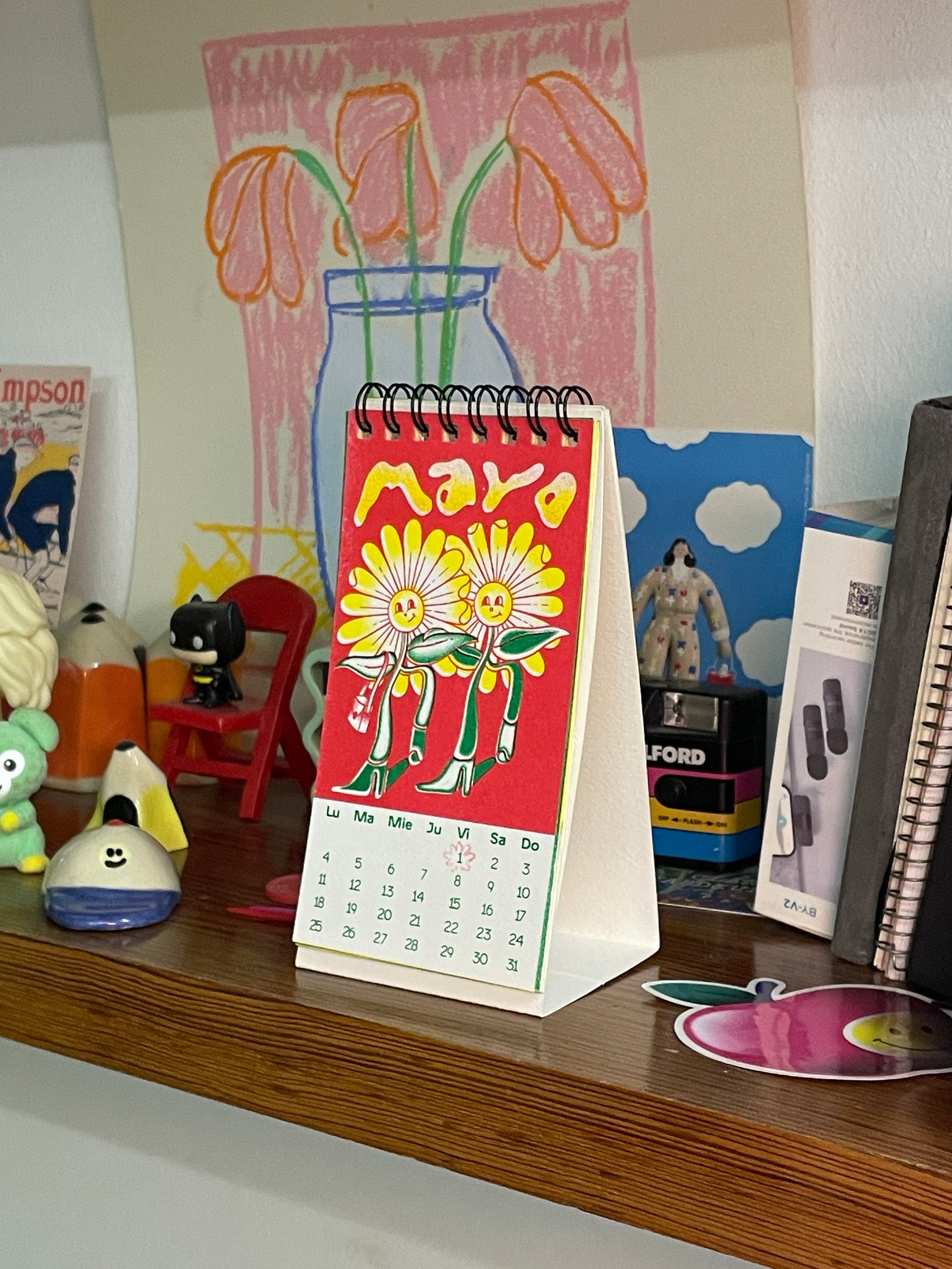 Impreso en Risografía a 3 colores (rojo, amarillo y azul) sobre papel Fedrigoni de 200gr. Tamaño: 7x 14cm